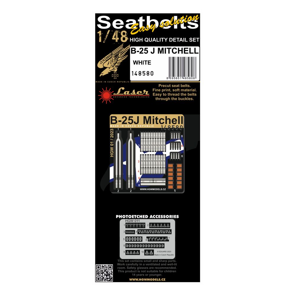 Textilní pásy určené pro model letadla B-25J Mitchell. Pásy jsou vyrobené z opravdového textilního mikrovlákna a v kombinaci s přiloženými fotoleptanými přezkami působí v kokpitu velice realisticky.