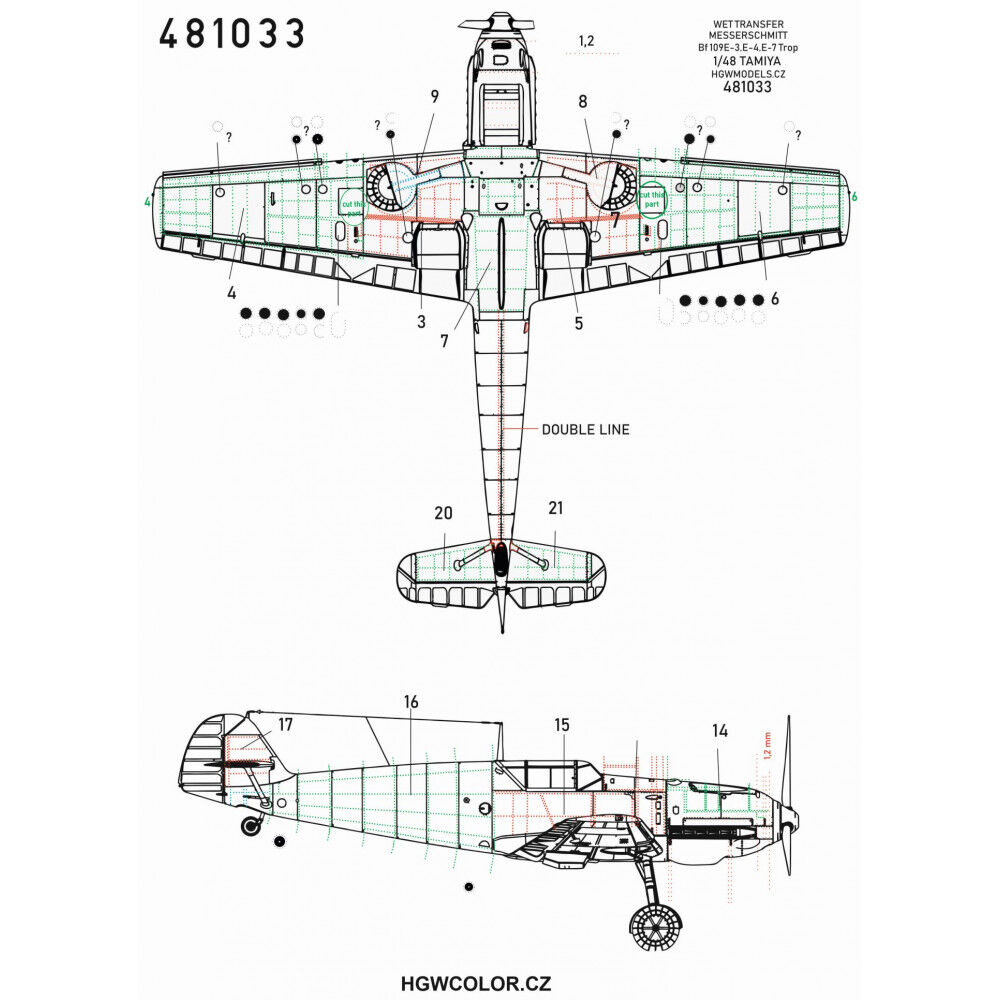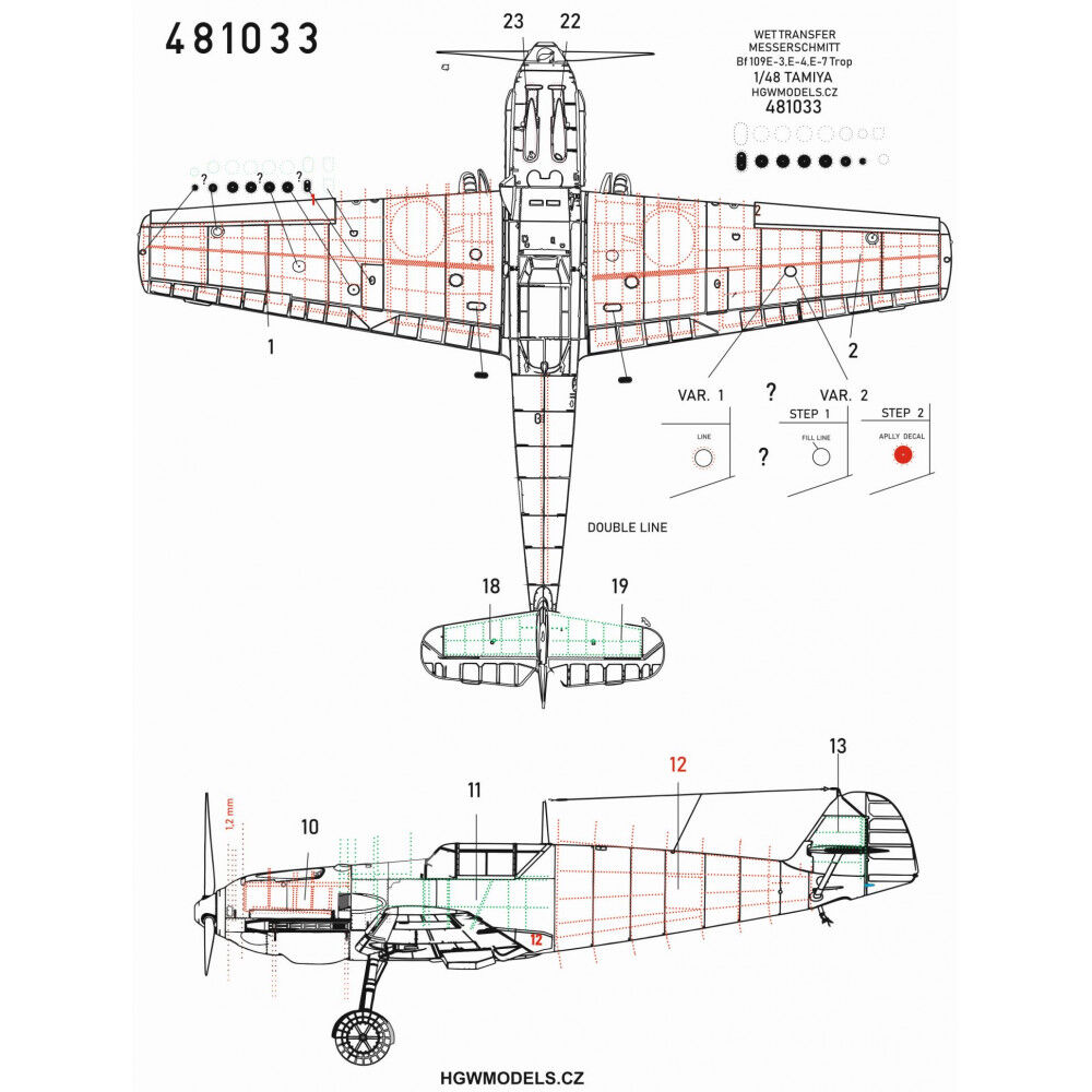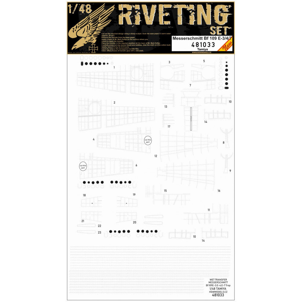Sada kompletních pozitivních nýtů pro Messerschmitt Bf109 E-3 / 4/ 7/ Trop v měřítku 1/48. Nýtovací sety od HGW Models dodávají povrchům plastových modelů mnohem realističtější vzhled. Doporučujeme nanášet je pod barvu a po nabarvení se k nim proleštit. Tento doplněk je vhodný pro stavebnici od Tamiya.