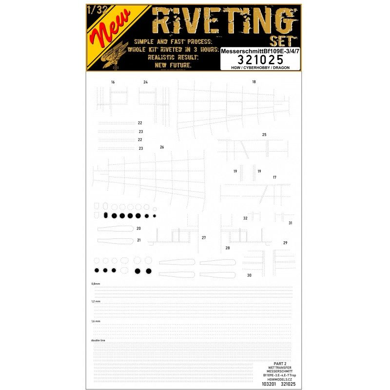 Sada kompletních pozitivních nýtů pro Bf109E-3/4/7 v měřítku 1/32. Nýtovací sety od HGW Models dodávají povrchům plastových modelů mnohem realističtější vzhled. Doporučujeme nanášet je pod barvu a po nabarvení se k nim proleštit. Tento doplněk je vhodný pro stavebnici od Dragon, Cyber Hobby, HGW .