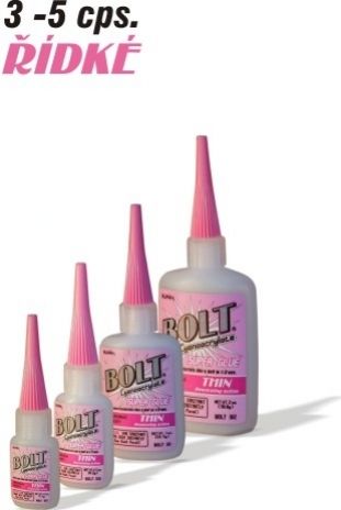 BOLT THIN™ - Nízkoviskózní Ethyl Cyanoacrylate. BOLT THIN™ - Řídké Ca lepidlo určené pro lepení materiálů přesně lícujících na sebe s maximální vůlí 0,05mm. Doba vytvrzení 1-3 sec. Ideální pro lepení kapilárních spojů - Excelentní penetrační schopnost. Ideální pro lepení systémem "složit a zakápnout. Lepí sklo, kov, pryž, dřevo, umělé hmoty apod. Nelepí teflon a podobné materiály. Lahvičky s lepidlem jsou naplněny ochrannou atmosférou pro zajištění maximální životnosti. Lepidla jsou vybavena specielními aplikátory, které eliminují zasychání během používání.