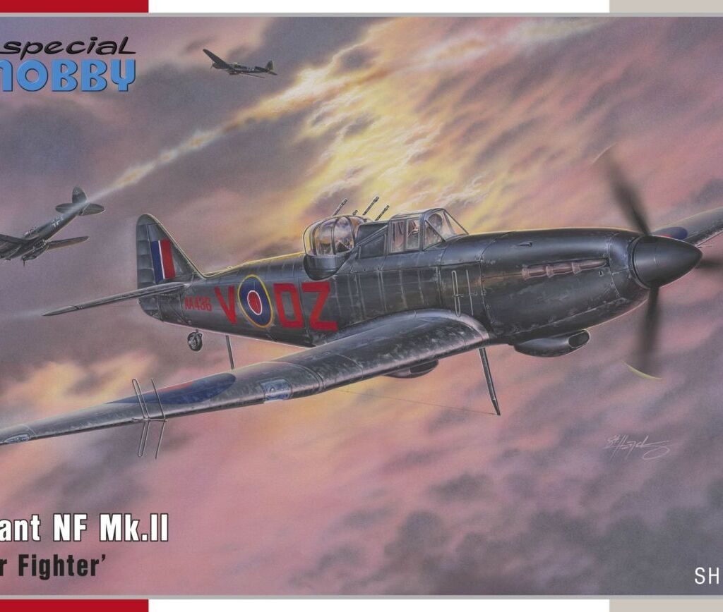 Reedice noční stíhací verze věžové stíhačny Defiant NF Mk.II, vybavené radarem. Tyto stíhačky bránily noční oblohu Velké Británie v průběhu druhé světové války. Stavebnice, jejíž plastové díly jsou doplněny anténami radaru z 3D tisku a leptů, nabízí tři celočerné stroje RAF tří různých squadron.