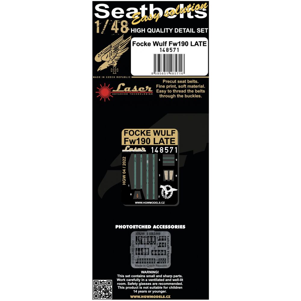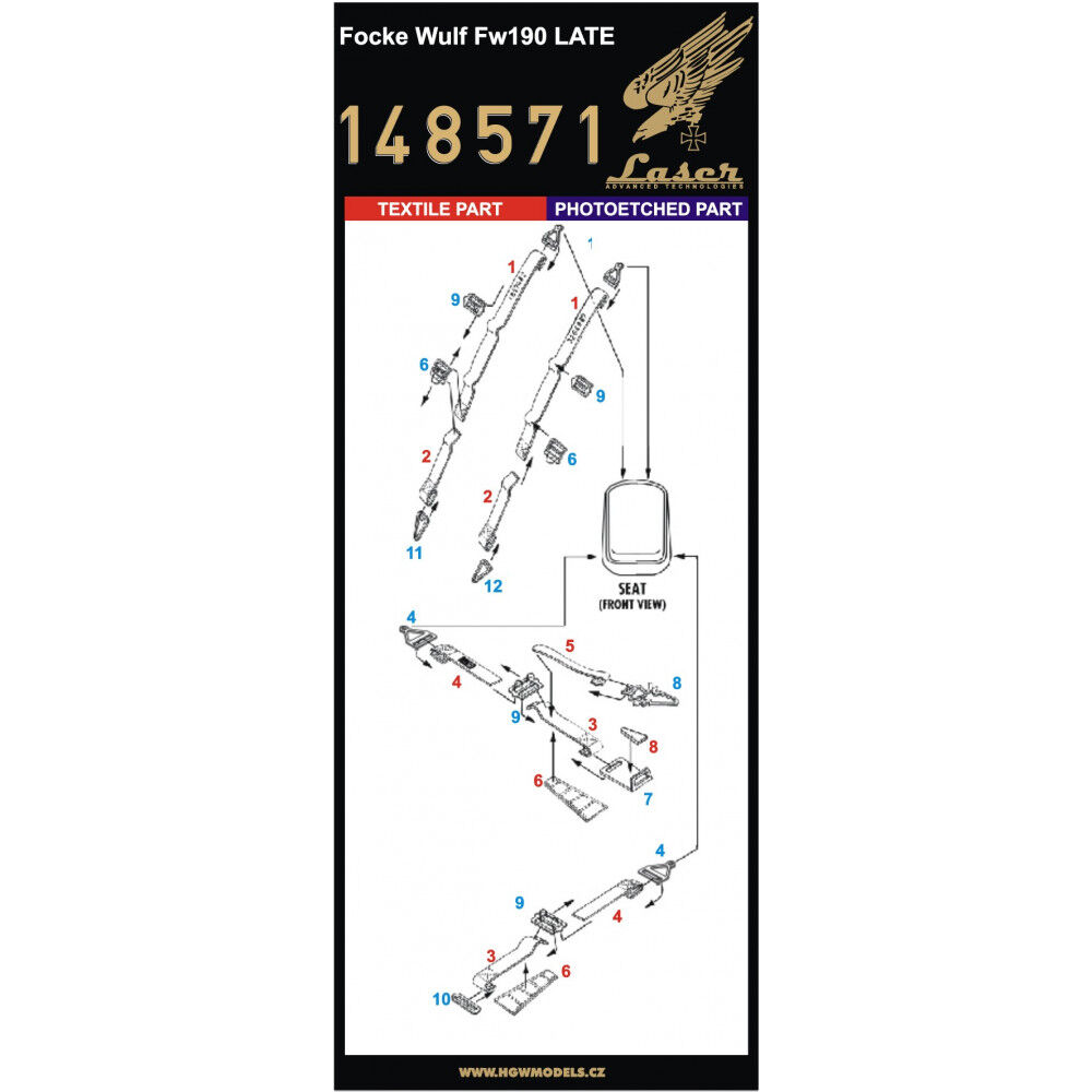 Textilní pásy určené pro model letadla Focke Wulf Fw190 Late. Pásy jsou vyrobené z opravdového textilního mikrovlákna a v kombinaci s přiloženými fotoleptanými přezkami působí v kokpitu velice realisticky.