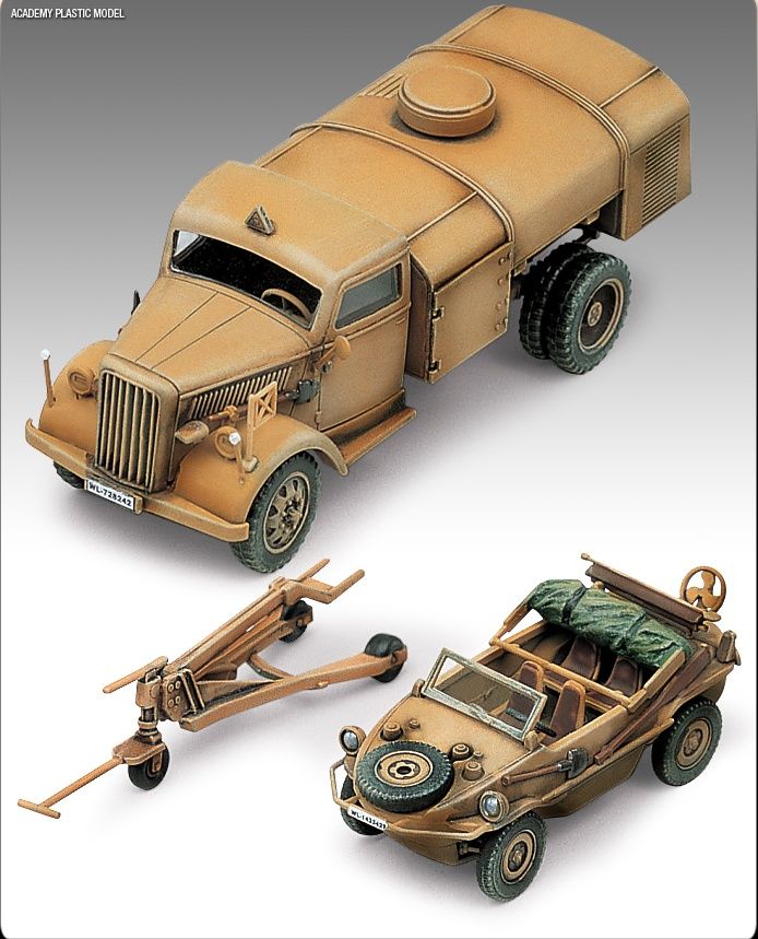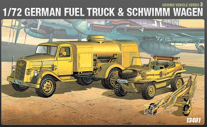 Balení obsahuje cisternu a Schwimmwagen a letištní vozík na podvěšení bomby