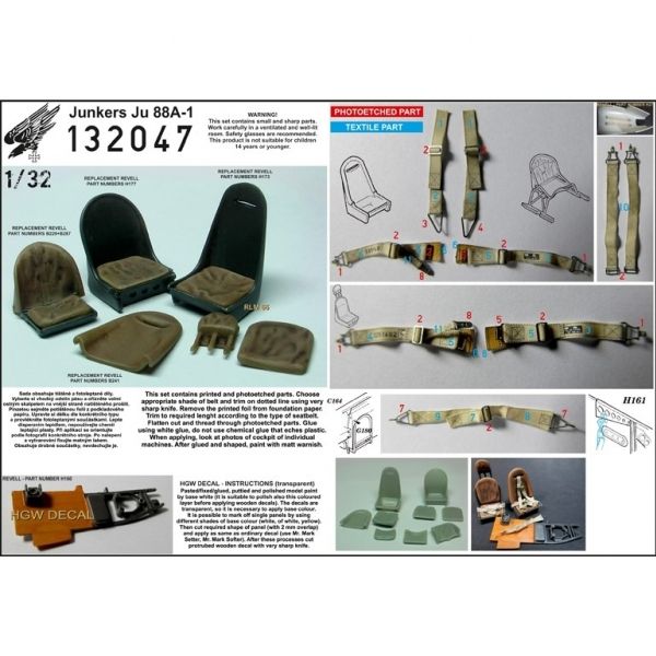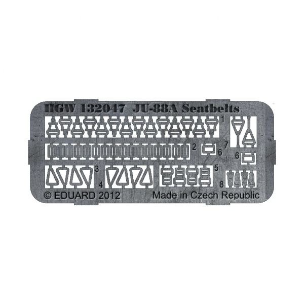Textilní pásy určené pro model letadla Junkers Ju 88A-1 od firmy Revell. Pásy jsou vyrobené z opravdového textilního mikrovlákna a v kombinaci s přiloženými fotoleptanými přezkami působí v kokpitu velice realisticky. Tento produkt je k dispozici v měřítku 1/32. Sada dále obsahuje resinové sedadlo a obtisk.