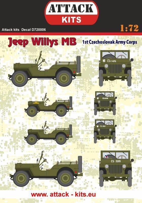 Sada obtisků umožňující postavit model legendárního vozidla Willys v markingu Československého armádního sboru z východní fronty. Sada je určena pro jakýkoliv plastikový model tohoto legendárního vozidla v měřítku 1/72.