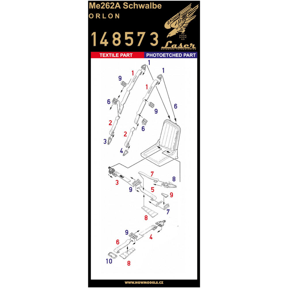 Textilní pásy určené pro model letadla Me262A Schwalbe. Pásy jsou vyrobené z opravdového textilního mikrovlákna a v kombinaci s přiloženými fotoleptanými přezkami působí v kokpitu velice realisticky.