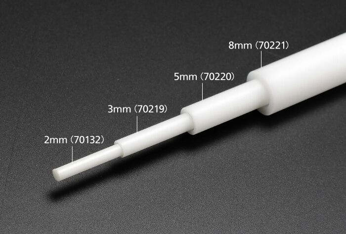 bílé styrenové trubky. Trubky o průměru 3 mm, 5 mm a 8 mm mají vnitřní průměr 2 mm, 3 mm a 5 mm