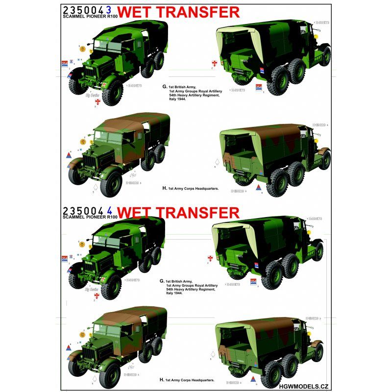 Popisky pro model Scammel Pioneer R100 v měřítku 1/35. Technologie mokrého transferu po jehož aplikaci zůstává na povrchu pouze text nebo symbol a nejsou patrné žádné stopy po laku či obtiskovém filmu.
