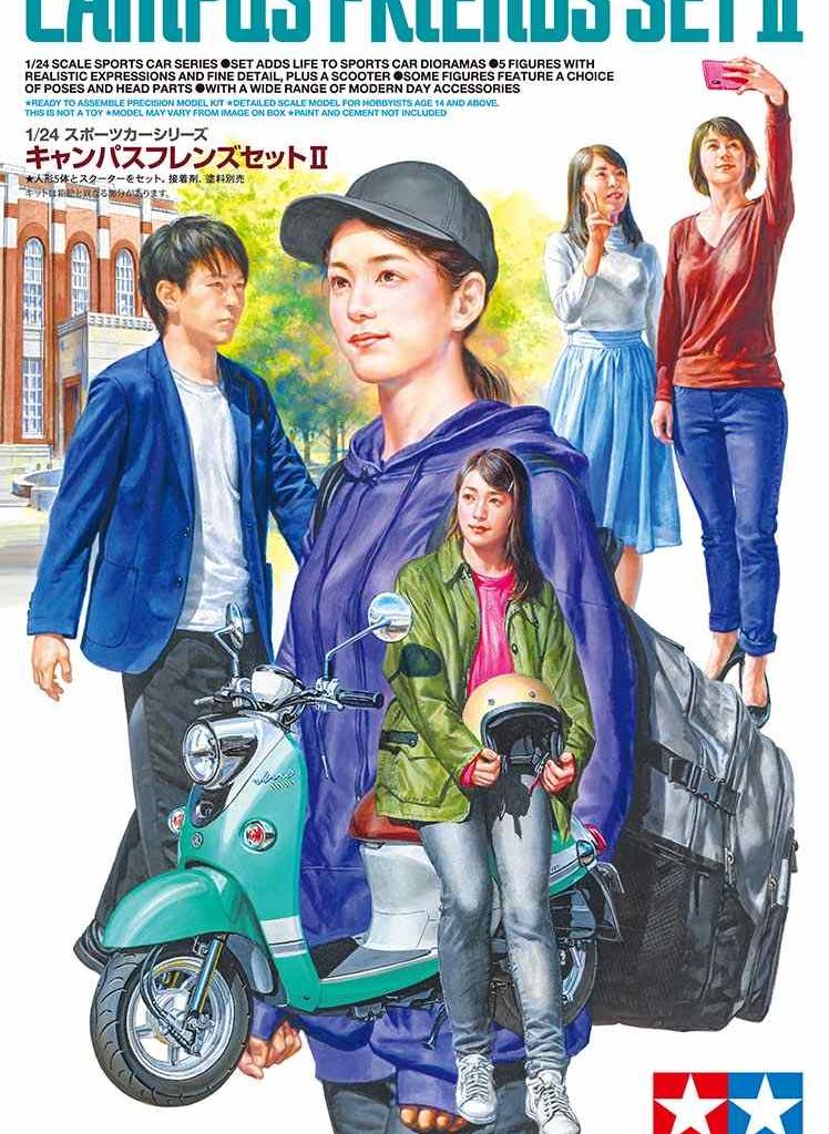 Balení obsahuje 5ks nesestavených a nenabarvených figurek v měřítku 1/24 a model skůtru Yamaha VINO.