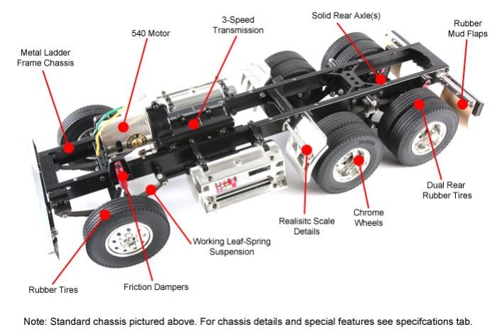 Stavebnice obsahuje mechanickou část. Pro zprovoznění modelu je potřeba dokoupit vícekanálovou RC soupravu, servo řízení a řazení převodovky, elektronický regulátor rychlosti, baterii pro pohon a nabíječku.