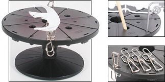 Otočná deska má různé zářezy a otvory pro přichycení stříkaných dílů.
