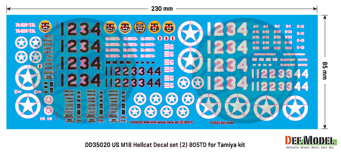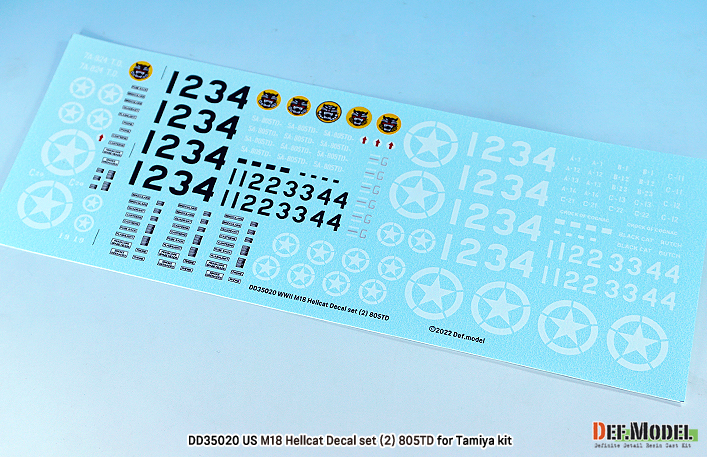 Sada obtisků pro M18 Hellcat 1/35. Reprodukované jedinečné označení jednotek americké armády. Součástí jsou obtisky do interiéru Konfigurace obtisku, která dokáže reprodukovat M18 TD během druhé světové války pro 4 vozidla. Obsahuje obtisky pro 824TD jako bonus.
